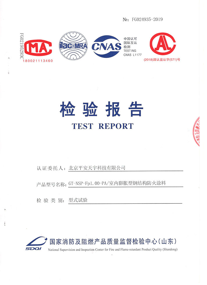 1.防火性能:该涂料经“国家固定灭火系统和耐火构件质量监督检验中心”检验合格、并通过“应急管理部消防产品合格评定中心”自愿性认证认可。该涂料耐火时间可根据不同分别达到2.5h、2.0h、1.5h、1.0h的耐火时间。