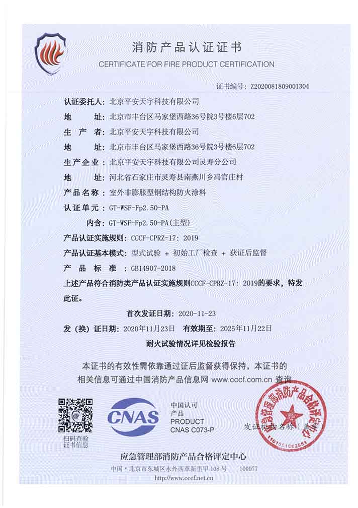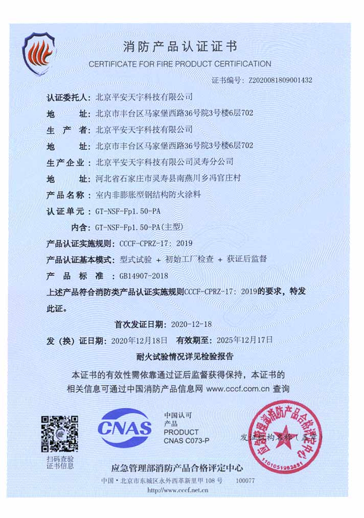 1.防火性能:该涂料经“国家固定灭火系统和耐火构件质量监督检验中心”检验合格、并通过“应急管理部消防产品合格评定中心”自愿性认证认可。该涂料耐火时间可根据不同需求满足1.5h、2.0h、2.5h、3.0h耐火时间。