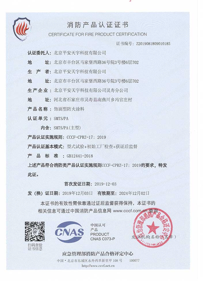 我公司生产的SMTS/PA饰面型防火涂料系水性木结构防火涂料,经《国家固定灭火系统和耐火构件质量监督检验中心》检验,理化性能达标,防火性能一级。产品各项技术性能指标均符合GB12441-2018标准。该涂料涂层遇火发泡膨胀,形成海绵状防火隔热层与火源隔离,可在一定时间内有效的保护易燃基层,可广泛应用于工业和民用建筑的术结构件、易燃板材和烟道、风道等的防火保护。